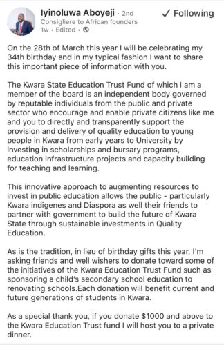 The LinkedIn post made by Mr Aboyeji